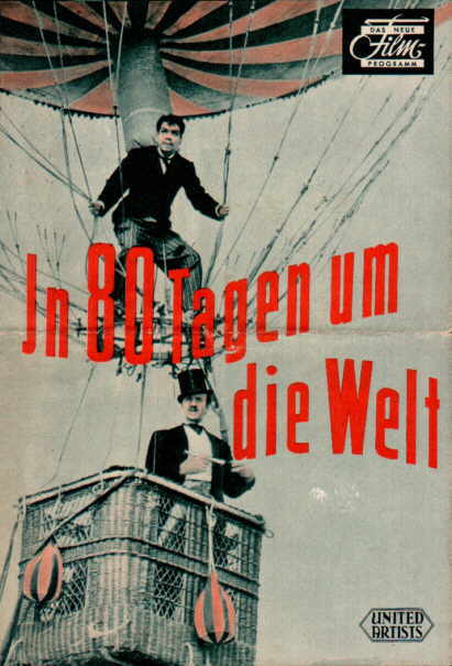 Dieses Werk ist ein richtiger Bilderrausch: Mit viel Aufwand hatte man ein stimmiges Ambiente aufgebaut. Neben den aufwendigen Kulissen und den exotischen Schauplätzen setzte man auch auf Masse: So wirkten laut Filmlexikon 70000 Statisten, 8000 Tiere und 48 Hollywoodstars mit. Gedreht wurde in 13 Ländern. Lohn der Mühe waren 5 Oscars. Unsere Geschichte beginnt passfähig zum Original mit der Vorstellung der Hauptakteure. Dazu gehört zu allererst David Niven, dem die Rolle des Fogg auf dem Leib geschrieben war. Eine gute Ergänzung dazu ist der „Hans Dampf in allen Gassen“ – Passepartout alias Cantinflas. Wir lernen Fogg in seinem Club kennen, der wie auch viele andere Dinge, als so britisch wie möglich dargestellt wird. Thema ist natürlich wieder der Raub in der Bank of England, der ja die berühmteste Wette der Literatur auslöste. Und so setzen sich die Beiden wie bekannt in Richtung Süd-Osten in Bewegung. Doch schon nach der Kanalüberquerung beginnen die ersten Probleme: Der Zug nach Marseille ist durch eine Überschüttung der Gleise ausgefallen. Dies erfahren unsere Reisenden im Reisebüro „Thomas Cook“. Dort hat man auch gleich eine Lösung parat: Ein Ballon stände zu Verkauf. Phileas schlägt zu. Allerdings lässt die Navigation des wind abhängigen Gefährts etwas zu wünschen übrig. Man driftet im Süden Frankreichs zu weit nach Westen ab und die spanische Grenze wird überquert. Dies ist dem Drehbuch willkommener Anlass, dem Zuschauer fast zehn Minuten einen spanischen Folkloreabend zu bieten. Als Sahnehäubchen muss Passepartout auch noch als Stierkämpfer agieren, um eine Passage nach Marseille im wahrsten Sinne des Wortes zu erkämpfen. In London stehen, nachdem man schon von der Zugunterbrechung gehört hatte, die Wetten gegen Fogg inzwischen auf 30 zu 1. Nachdem Fogg & Co Suez erreicht haben, wird ihnen das Gequatsche Passepartouts zum Verhängnis. Detektiv Fix heftet sich den beiden an die Fersen, nachdem er aus den Erzählungen des Dieners schließen muss, dass er den Bankräuber aus London vor sich hat. Welch raffinierte Tarnung - einfach eine Wette vorspielen! In Bombay droht schon wieder Unheil. Passepartout nutzt seine Erfahrungen als Stierkämpfer, um dem Treiben einer Kuh an einem Gemüsestand ein Ende zu bereiten. Als Zuschauer erkennen wir sofort die Gefahr – diese Handlung an dem heiligen Tier muss natürlich eine Meute Rache schreiender Inder auf den Plan rufen. Gerade so erreicht man noch den Zug der frisch fertiggestellten trans-indischen Bahn.